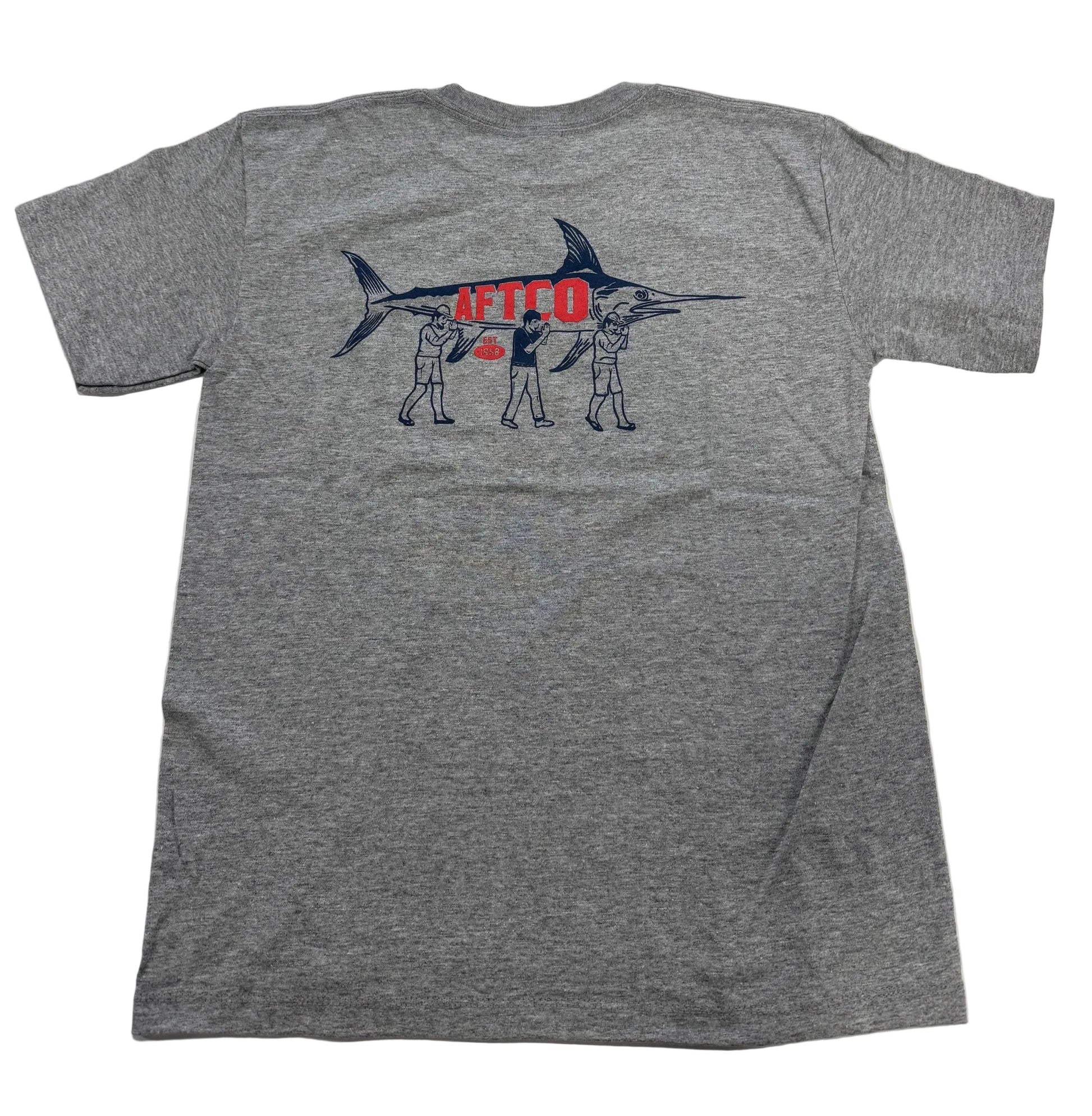 Teamwork Tシャツは、3人のアングラーが水上での一日の後、釣りあげた自慢のカジキを掲げています。チームワークはコットンとポリエステルの混紡素材で、耐久性と通気性に優れたヘザーTシャツです。