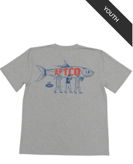 Teamwork Tシャツは、3人のアングラーが水上での一日の後、釣りあげた自慢のカジキを掲げています。チームワークはコットンとポリエステルの混紡素材で、耐久性と通気性に優れたヘザーTシャツです。